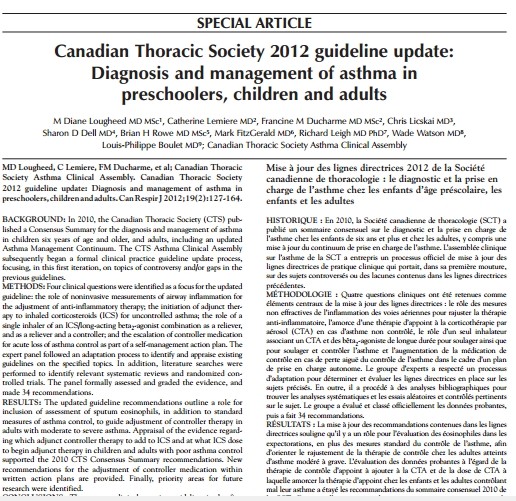 英文标题:Canadian Thoracic Society 2012 guideline update: Diagnosis and management of asthma in preschoolers, children and adults