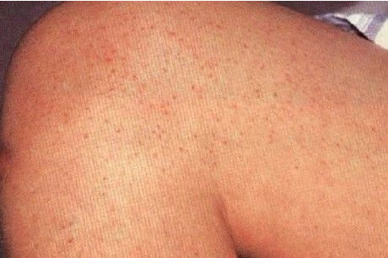 (3)皮疹:于发病后2~5日出现,初见躯干及腹部,渐次延及颈和四肢,部分患者见于面部。皮疹呈多样性,可为斑丘疹、麻疹样皮疹、猩红热样皮疹、红斑疹,稍有刺痒,可见皮岛。也有在发热最后1日或在热退后,于脚、腿背后、踝部、手腕背面、腋窝等处出现细小淤斑,1~3日内消退,短暂遗留棕色斑。皮疹一般与体温同时消退。