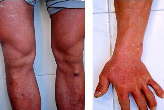(2)伴发症状:头痛、背痛、肌肉关节疼痛,眼眶痛,眼球后痛等。可有感觉过敏、恶心、呕吐、腹痛、食欲差、腹泻和便秘等消化道症状。颜面和眼结膜充血,颈及上胸皮肤潮红。