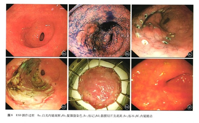 (2)操作步骤:操作大致分为5步:①病灶周围标记;②黏膜下注射,使病灶明显抬起;③环形切开黏膜;④黏膜下剥离,使黏膜与固有肌层完全分离开,一次完整切除病灶;⑤创面处理:包括创面血管处理与边缘检查。见图8。