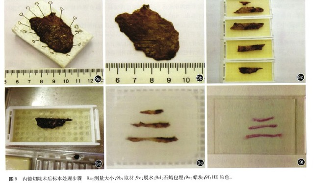 ②制片染色:将组织以2mm为间隔连续平行切片,按顺序放入包埋盒,组织脱水、浸蜡、石蜡包埋,切片厚度4-6 um;(图9)③病理报告:须描述肿瘤的大体形态、部位、大小、组织学类型、分化程度、浸润深度及切缘、是否有淋巴管和血管浸润,以确定内镜下切除是否达到完全切除或还需要补充治疗。