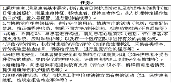 主要护理任务是指在临床工作初期(0~3年)的护士,在执业活动中常见的护理工作任务。考试所涉及的护理任务共有7类,分别是: