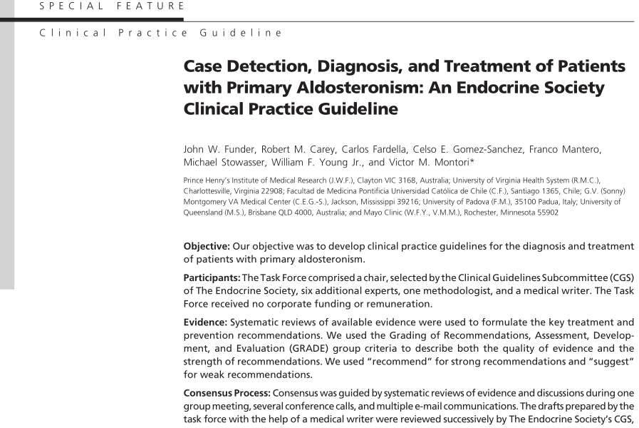 英文标题:Case Detection, Diagnosis,and Treatment of Patients with Primary Aldosteronism:An Endocrine Society Clinical Practice Guideline