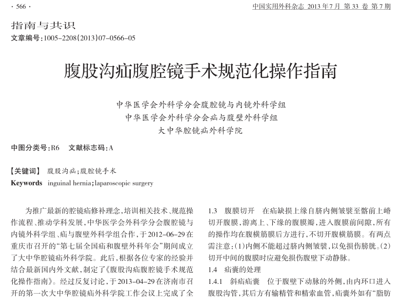 2013腹股沟疝腹腔镜手术规范化操作指南