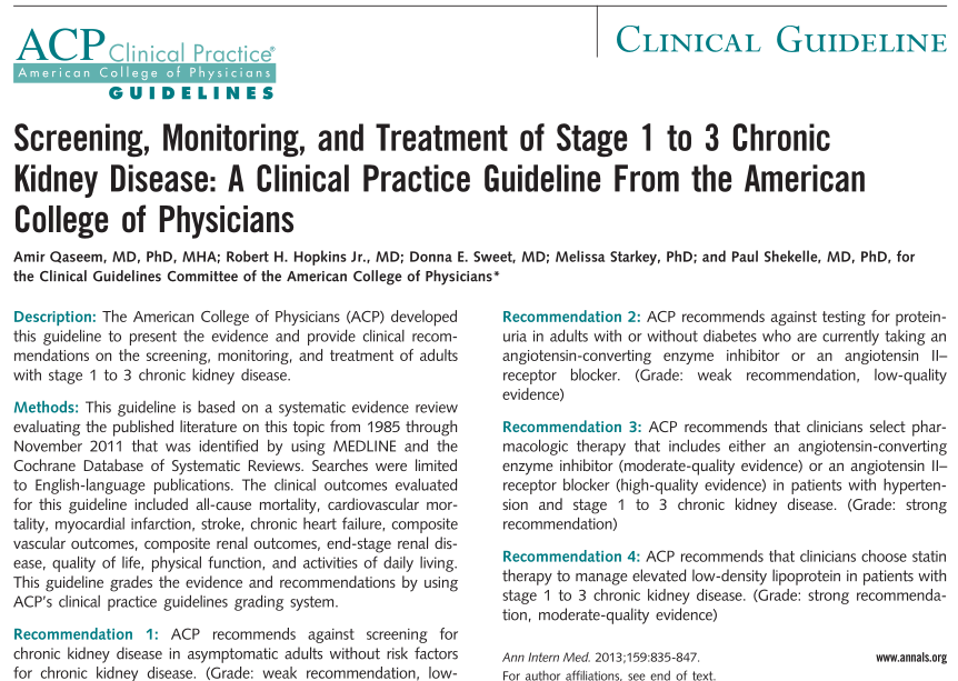 英文标题:Screening, Monitoring, and Treatment of Stage 1 to 3 Chronic Kidney Disease: A Clinical Practice Guideline From the Clinical Guidelines Committee of the American College of Physicians.