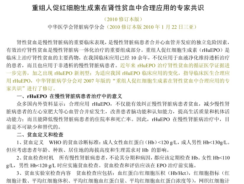 2010重组人促红细胞生成素在肾性贫血中合理应用的专家共识
