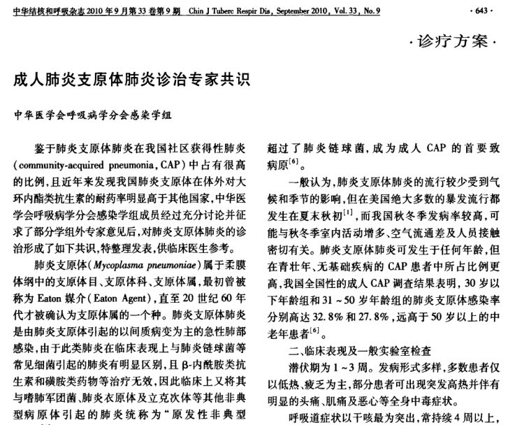 2010成人肺炎支原体肺炎诊治专家共识