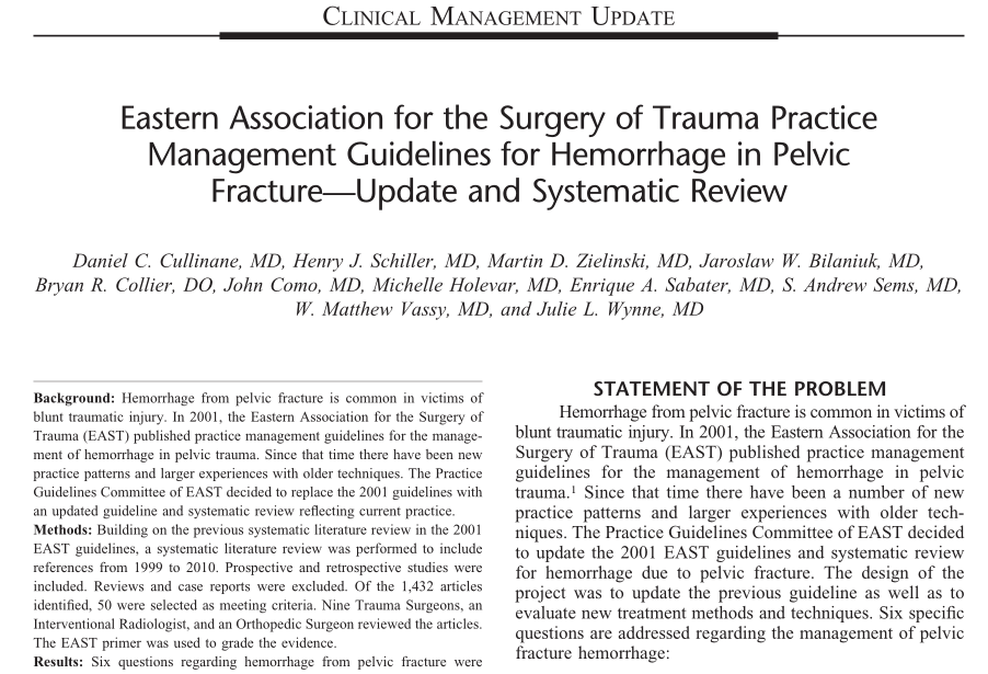 英文标题:Eastern Association for the Surgery of Trauma practice management guidelines for hemorrhage in pelvic fracture--update and systematic review