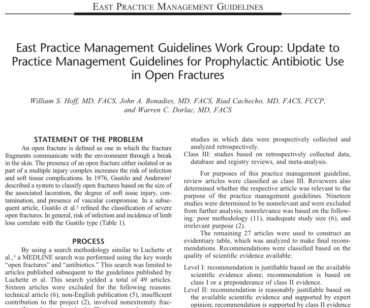 英文标题: East Practice Management Guidelines Work Group: update to practice management guidelines for prophylactic antibiotic use in open fractures.