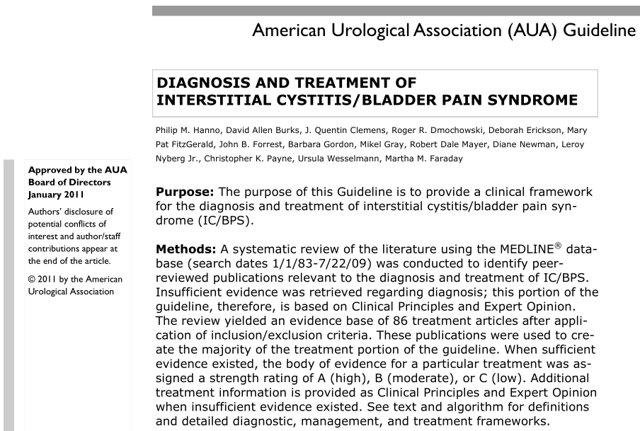 英文标题:DIAGNOSIS AND TREATMENT OF INTERSTITIAL CYSTITIS/BLADDER PAIN SYNDROME