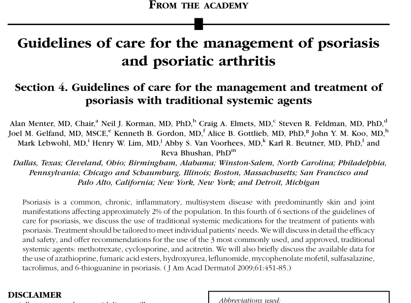 银屑病及银屑病性关节炎的指南:第4部分-银屑病的传统的系统治疗指南(AAD 2009)