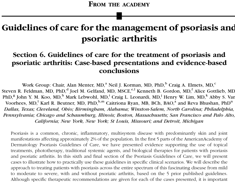 银屑病及银屑病性关节炎的指南:第6部分-关于银屑病及银屑病性关节炎的治疗指南:基于病例及研究的结论(AAD 2011)