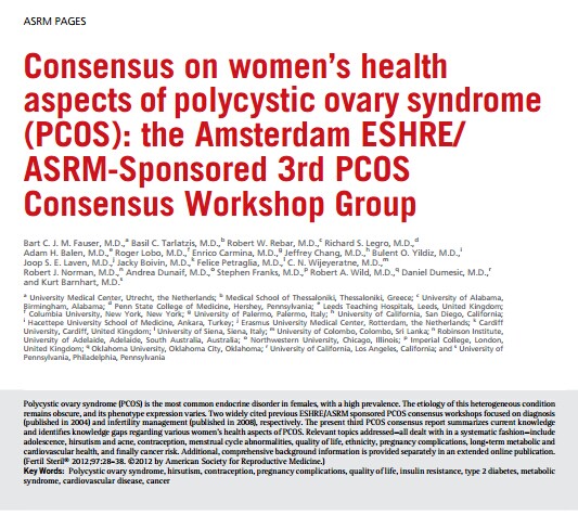 英文标题:Consensus on women's health aspects of polycystic ovary syndrome (PCOS): the Amsterdam ESHRE/ASRM-Sponsored 3rd PCOS Consensus Workshop Group.
