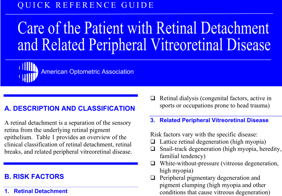 英文标题:Care of the patient with retinal detachment and related peripheral vitreoretinal disease.