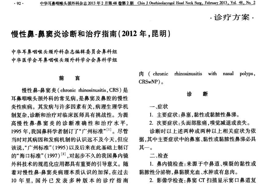 慢性鼻-鼻窦炎诊断和治疗指南(2012年,昆明) 发布日期:2013-02-01英文标题:制 定 者: 中华医学会耳鼻咽喉头颈外科学分会鼻科学组 中华耳鼻咽喉头颈外科杂志编辑委员会鼻科组 中华医学会耳鼻咽喉头颈外科学分会出 处: 中华耳鼻咽喉头颈外科杂志2013年2月第48卷第2期 指南下载 : 慢性鼻-鼻窦炎诊断和治疗指南(2012年,昆明).pdf