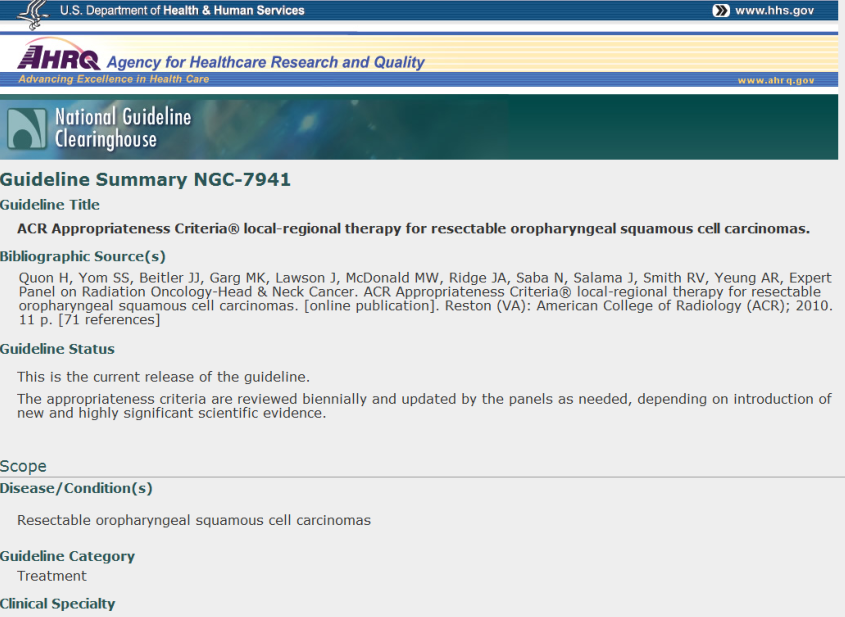 英文标题:2010 ACR Appropriateness Criteria local-regional therapy for resectable oropharyngeal squamous cell carcinomas