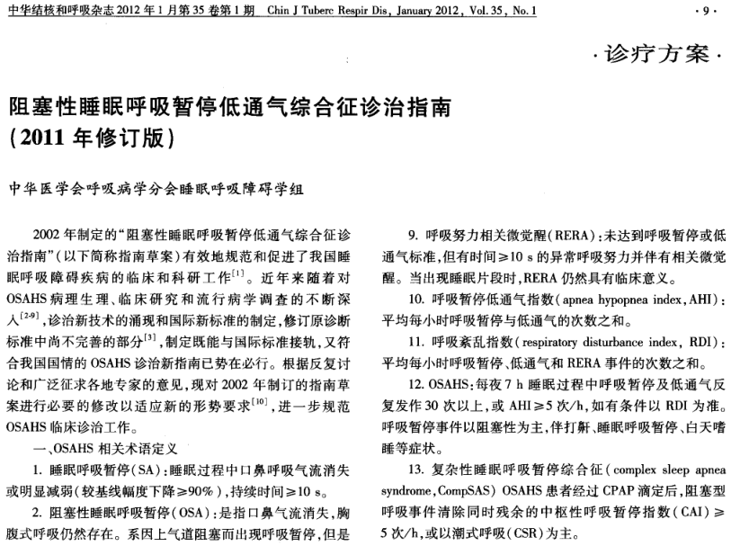指南下载:阻塞性睡眠呼吸暂停低通气综合征诊治指南(2011修订版).pdf