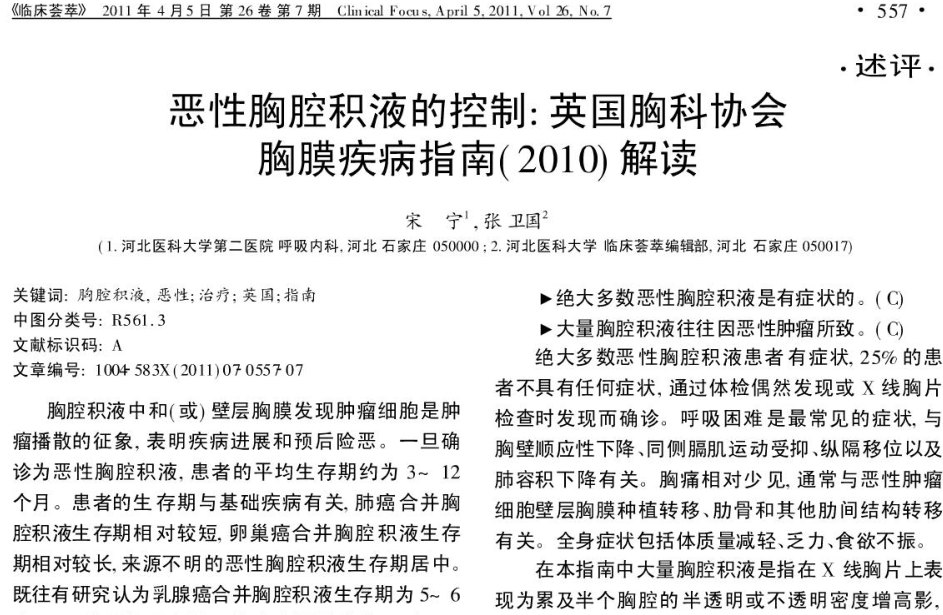 解读下载:恶性胸腔积液的控制:2010英国胸科协会胸膜疾病指南解读.pdf