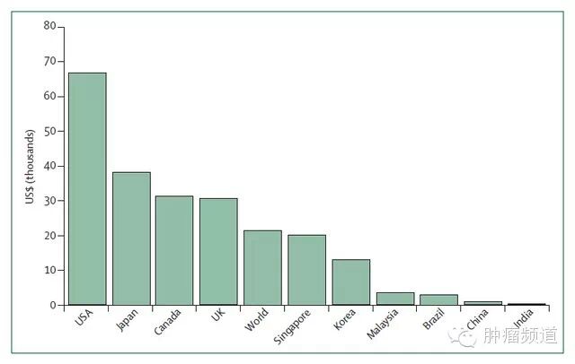 图2.平均每位乳腺癌患者的花费(数据来自2009年经济学人智库)