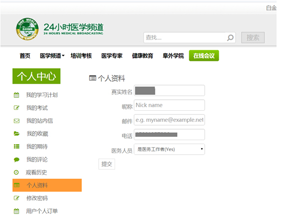 登录24小时医学频道,进入【个人中心】-【个人资料】,输入电话号码,再点击【提交】。