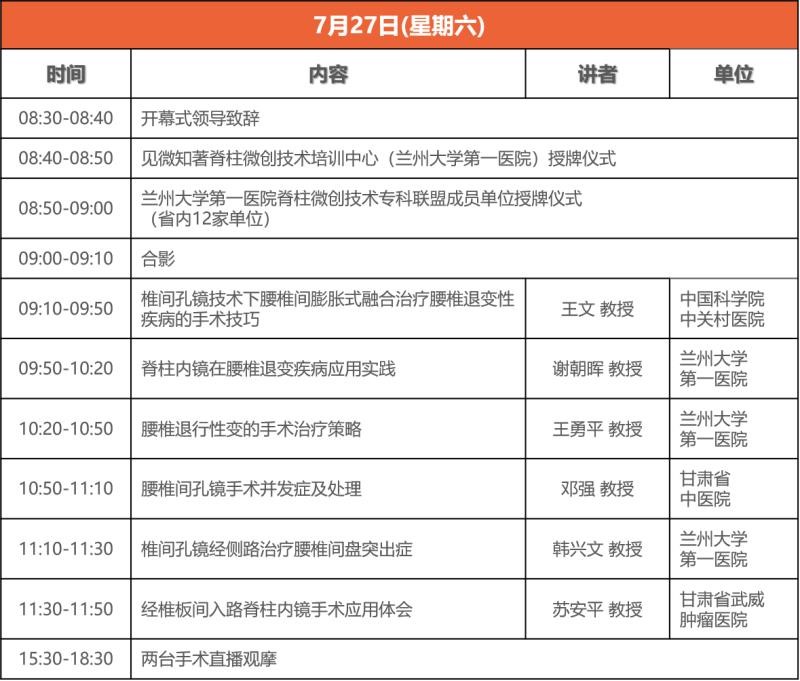为了推广脊柱微创技术,提高临床医生的操作技能,“见微知著”中国脊柱微创技术普及项目-脊柱内镜技术新进展理论及实践技能培训班(兰州站)暨2019甘肃脊柱内镜技术萃英论坛即将于7月26日到28日在兰州大学第一医院举行。本期培训班将邀请省内外多位知名专家授课。